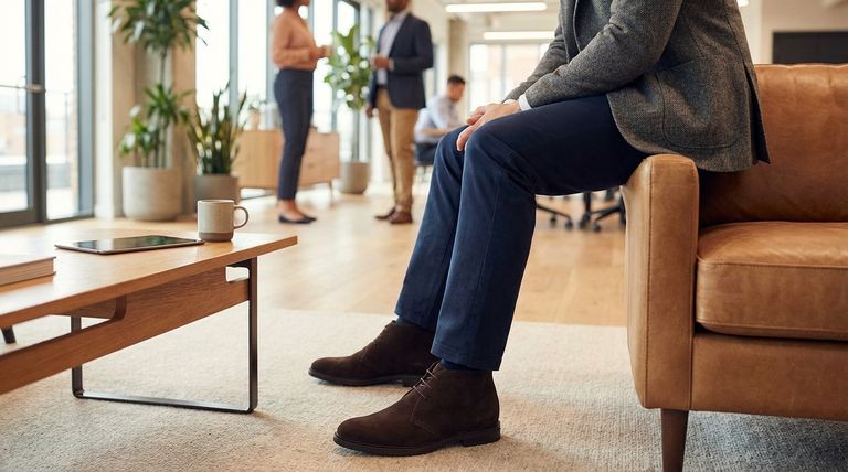 - Se o seu foco principal é a versatilidade diária no escritório: Combine botas chukka de camurça marrom escura com calças chino azul marinho e uma camisa de botões para um visual confortável, mas respeitoso.