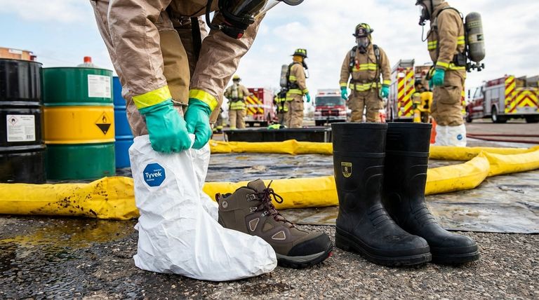 Para proteger botas de couro caras durante respostas a materiais perigosos, as alternativas mais comuns e eficazes são usar botas de borracha dedicadas ou sobrebotas descartáveis de Tyvek. Essas soluções permitem que os socorristas preservem suas botas de combate a incêndios estruturais primárias, que são caras e difíceis de descontaminar, para seu propósito pretendido.