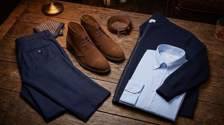 A chave para elevar as botas deserto para a noite é combinar a sua herança robusta com cores mais profundas e clássicas como azul marinho, verde escuro e cinza carvão. Este contraste preenche a lacuna entre calçado casual e um traje polido e intencional.