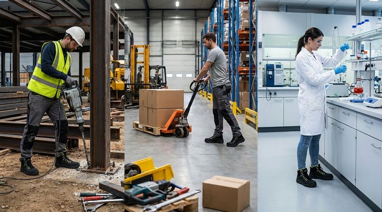 Trabalhadores que operam máquinas pesadas ou manuseiam materiais perigosos enfrentam riscos significativos. O calçado aqui serve a um duplo propósito: proteção física contra impacto e proteção de barreira contra exposição química.