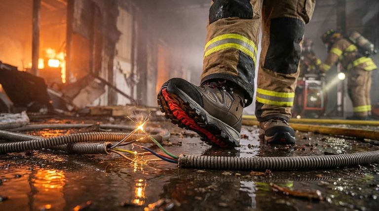 Uma cena de incêndio é um ambiente eletricamente imprevisível. A proteção contra risco elétrico (EH) transforma uma bota de simples calçado em um equipamento de salvamento, usando materiais não condutores para interromper o fluxo de eletricidade através do corpo.